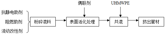 UHMW-PE的阻燃、抗靜電及易加工復合改性采用了無鹵阻燃抗靜電改性方法,其為將100份的超高分子量聚乙烯、5-15份導電材料、1-5份聚磷酸銨、0.1-10份聚硅氧烷、1-10份納米阻燃劑、1-10份聚合物界面橋粘劑、1-8份分散劑以及0.5-4份抗氧化劑經(jīng)反應釜進行混配,然后將混合物用單螺桿擠出機擠出成型管材。配方中的導電材料選自炭黑、石墨和銅粉中的一種或一種以上的混合物,聚磷酸銨是晶體結構為Ⅱ型的聚磷酸銨,聚硅氧烷選自聚二甲基硅烷、聚甲基苯基硅氧烷和線性硅氧烷-乙炔共聚物的一種或一種以上的混合物,納米阻燃劑選自粒徑為10-100納米的二氧化硅、滑石粉和氫氧化鎂中的一種或一種以上的混合物。