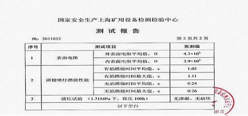 阻燃和抗靜電改性UHMW-PE管材礦安檢測結果: