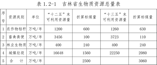 綜上,吉林省生物質(zhì)資源總量見表1.2-1。