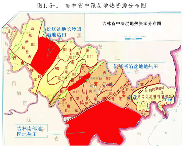 吉林省地熱能資源主要分布在東部長白山天池溫泉群、撫松縣、臨江市等地;中部長春雙陽、四平伊通等地;西部長嶺等地。目前,地熱能開發(fā)僅限于溫泉、洗浴和養(yǎng)殖,從長遠看具有供熱和發(fā)電潛力。此外,在省內(nèi)地表地下水資源豐富地區(qū)以及利用城市污水可以開發(fā)地源熱泵用于供暖制冷。中深層地熱資源分布詳見圖1.5-1。
