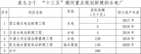 4.挖掘水電資源開發(fā)潛力。加快推進豐滿大壩重建工程、敦化抽水蓄能電站、望江樓、文岳水電站建設(shè),力爭按期建成投產(chǎn),增加省內(nèi)電力調(diào)峰能力,促進新能源的消納,新增裝機容量268萬千瓦,其中抽水蓄能140萬千瓦,常規(guī)水電128萬千瓦,詳見表5.2-7。