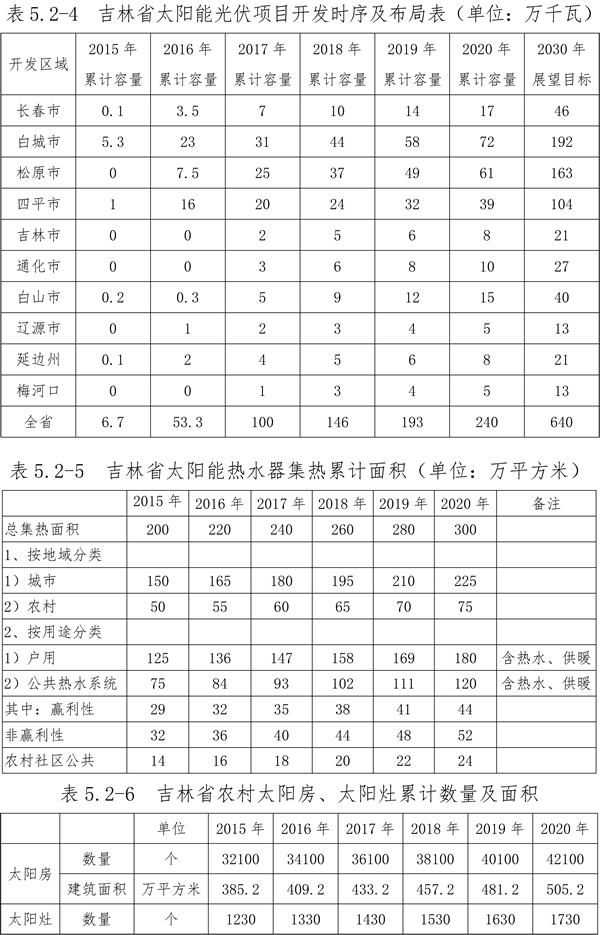 ?。ㄈ┨柲芾萌〉弥卮笸黄?。按照“有序發(fā)展、重點突出、多元利用”的原則,重點推進雙遼慶達、洮南全晟、中航重工工業(yè)園區(qū)等光伏發(fā)電項目建設(shè)。到2015年底,吉林省太陽能光伏裝機容量達到6.7萬千瓦,實現(xiàn)從無到有的重大突破;太陽能熱水器集熱面積達到200萬平方米,其中城鎮(zhèn)太陽能熱水器集熱面積達到150萬平方米,農(nóng)村太陽能熱水器集熱面積達到50萬平方米;太陽能暖房32100戶,太陽灶1230臺。