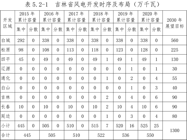 “十三五”期間新增裝機規(guī)模105萬千瓦,吉林省風電項目開發(fā)時序及布局見表5.2-1。