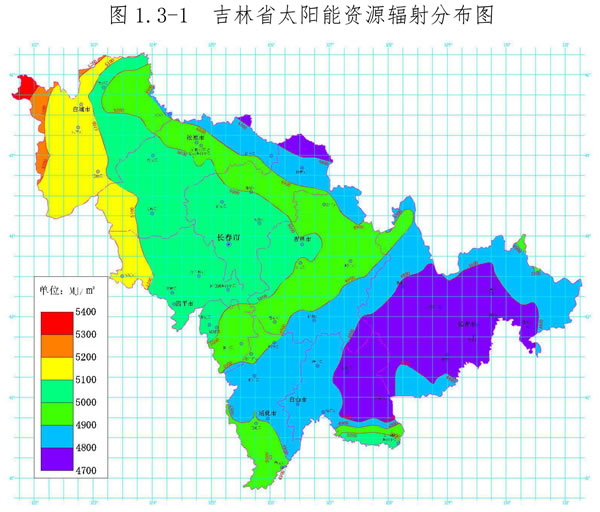 吉林省太陽能資源豐富,全省多年平均日照時數(shù)為2200~3000小時,年太陽總輻射量為5051.7兆焦耳/平方米,根據(jù)太陽能資源評估方法(QX/T 89-2008),屬資源很豐富級別,全省太陽能資源總體屬于二類。
