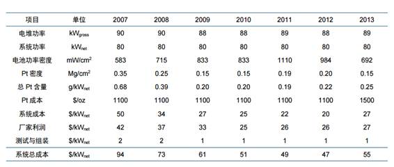 工業(yè)化和商業(yè)化的絕大多數(shù)問題都可以歸結(jié)到成本之上,燃料電池亦不例外。近10年來,燃料電池的成本控制一直是研究機(jī)構(gòu)和實(shí)業(yè)界最重要的目標(biāo)之一。孜孜不倦的努力也取得了回報(bào),基于2013年的技術(shù)水平,在年產(chǎn)50000套的規(guī)模下,車用80kW功率的PEMFC燃料電池成本降低到55美元/kW(請(qǐng)注意上述各種約束條件?。^之2002年的275美元/kW下降了80%,距離2017年30美元/kW的目標(biāo)僅數(shù)步之遙(對(duì)此需要指明兩點(diǎn):其一,30美元/kW的成本在2008年左右還是2015年計(jì)劃實(shí)現(xiàn)的目標(biāo);其二,2012年成本估算曾經(jīng)低至47美元/kW,但基于更嚴(yán)格的熱排放指標(biāo)和最新的Pt金屬價(jià)格,這一估算在2013年被調(diào)高了)。