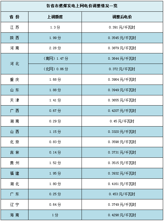 至今,已經(jīng)有20個省份陸續(xù)公布了本省的燃煤標(biāo)桿電價(jià)調(diào)整的情況。這20省的燃煤標(biāo)桿電價(jià)提高了0.14~2.28分/kWh,如下表所示。