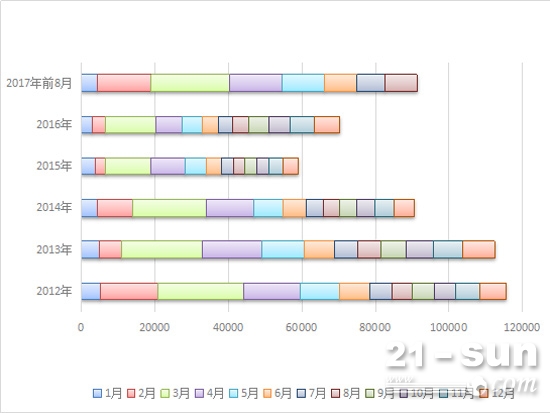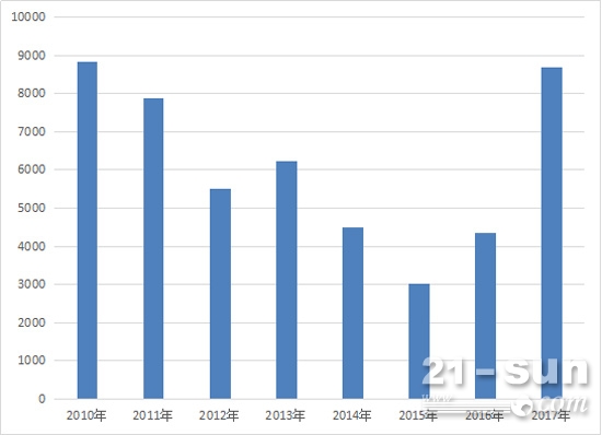 歷年8月份挖掘機(jī)銷量(2010年至2017年)