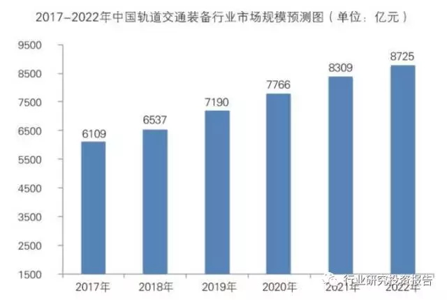 隨著我國在軌道交通方面的投資速度加快,到2022年,我國新增鐵路營業(yè)里程將超過1.1萬公里,新增軌道交通營業(yè)里程將超過4500公里。2017-2022年需要的鐵路客車車輛將在3萬輛以上,貨車車輛將在15萬輛左右,地鐵車輛將在2.7萬輛以上。