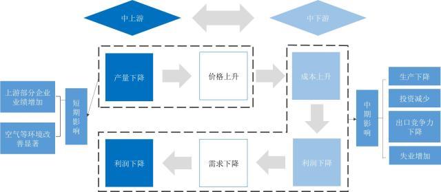 資本市場,一個廣為流傳的所謂邏輯是環(huán)保限產(chǎn)短期內(nèi)會對部分周期性產(chǎn)品價格產(chǎn)生支撐作用,但中期環(huán)保限產(chǎn)帶來的供給下滑會對經(jīng)濟(jì)基本面產(chǎn)生負(fù)面影響。在這一所謂邏輯下,“2+26”城市采暖期限產(chǎn)、環(huán)保督察嚴(yán)格落實,部分產(chǎn)品供給將出現(xiàn)顯著下滑(電解鋁、粗鋼、水泥等限產(chǎn)規(guī)模占比將超過8.4%、11.1%和16.3%),短期內(nèi)相應(yīng)產(chǎn)品的價格會出現(xiàn)明顯上升。中期來看,上游直接關(guān)停,中下游因原材料成本上升導(dǎo)致利潤縮窄,下游需求下降抵消價格上漲,繼而引發(fā)生產(chǎn)放緩、投資下滑。同時,環(huán)保容忍度提升降低出口競爭力,帶來失業(yè)和消費(fèi)能力的降低。長期來看,環(huán)保限產(chǎn)不能增加環(huán)保設(shè)備、缺乏市場化手段來內(nèi)生環(huán)境成本,以至于高效產(chǎn)能面臨關(guān)停的窘境,最終對產(chǎn)業(yè)升級難起作用。