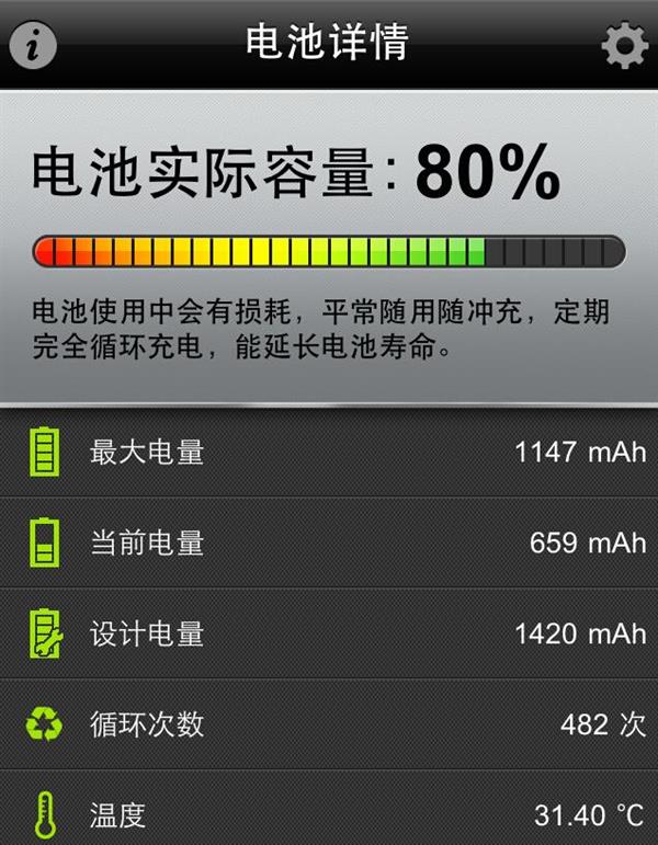 筆者在網(wǎng)上找到了兩個(gè)鋰電池循環(huán)充放電的例子,一張截圖顯示的是一塊1420mAh的iPhone 4鋰電池完成482次循環(huán)充放電后,電池剩余電量1147mAh,較比出廠容量衰減了20%