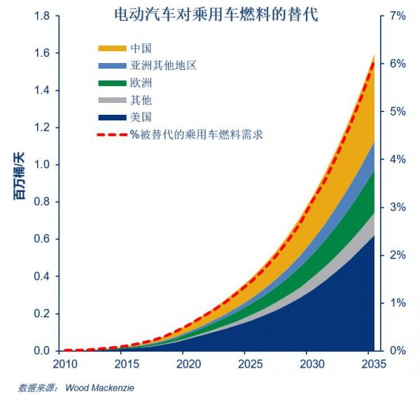 放眼全球,伍德麥肯茲預計2035年電動汽車將取代150萬桶/天(約6%)的乘用車燃料需求。對于單個區(qū)域來說,油品需求的取代量不單單取決于電動汽車的數(shù)量,還依賴于駕駛文化和傳統(tǒng)燃油車的燃料效率。以美國為例,雖然其2035年的電動汽車的數(shù)量將遠低于歐洲,但是駕駛文化以及對于大排量車的偏好導致電動汽車對油品需求的替代量超過其他地區(qū)。反觀歐洲,由于柴油化和小型轎車的普及,其傳統(tǒng)燃油車的燃料效率已經(jīng)達到較高水平,因此,乘用車燃料的替代效果并沒有美國明顯。