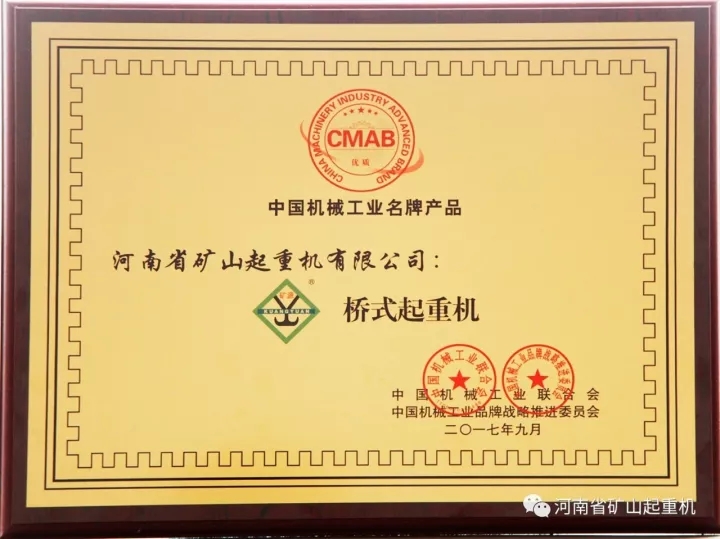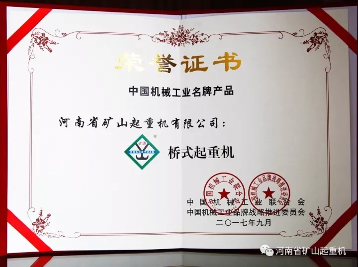 2017年9月26日,中國機(jī)械工業(yè)聯(lián)合會授予河南省礦山起重機(jī)有限公司“礦源牌橋式起重機(jī)”為“中國機(jī)械工業(yè)名牌產(chǎn)品”。