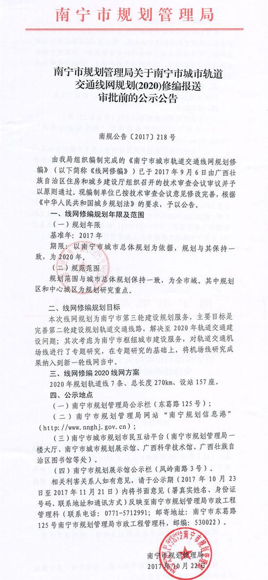 10月23日,南寧市規(guī)劃管理局發(fā)布了關(guān)于南寧市城市軌道交通線網(wǎng)(2020)修編報(bào)送審批前的公示公告,根據(jù)最新規(guī)劃,南寧將建設(shè)軌道線7條,總長度270km,設(shè)站157座,包括:
