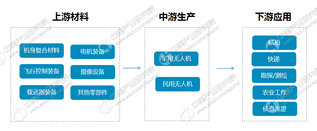 在無(wú)人機(jī)產(chǎn)業(yè)鏈中中,上游主要是各種制造無(wú)人機(jī)的材料,有機(jī)身復(fù)合材料、電機(jī)裝備、飛行控制裝備、攝像設(shè)備等;下游為各類民間、商業(yè)、軍工應(yīng)用領(lǐng)域,包括航拍、快遞、勘探、測(cè)繪以及偵查巡邏等。