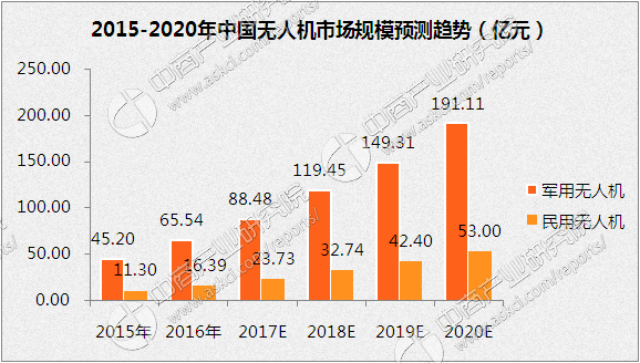 根據(jù)中商產(chǎn)業(yè)研究院發(fā)布的《2017-2022年中國(guó)無(wú)人機(jī)市場(chǎng)發(fā)展前景及投資機(jī)會(huì)分析報(bào)告》數(shù)據(jù)顯示,2015年中國(guó)民用無(wú)人機(jī)市場(chǎng)銷售規(guī)模達(dá)到11.3億元。隨著無(wú)人機(jī)應(yīng)用領(lǐng)域的逐漸擴(kuò)大,無(wú)人機(jī)市場(chǎng)需求逐漸提升,預(yù)計(jì)2017年中國(guó)民用無(wú)人機(jī)市場(chǎng)規(guī)模將達(dá)到23.73億元。2017年中國(guó)軍用無(wú)人機(jī)市場(chǎng)規(guī)模將達(dá)到88.48億元,未來(lái)將保持持續(xù)穩(wěn)定增長(zhǎng)。預(yù)計(jì)到2020年中國(guó)民用無(wú)人機(jī)市場(chǎng)將達(dá)53億元,軍用無(wú)人機(jī)將達(dá)191.11億元,中國(guó)無(wú)人機(jī)市場(chǎng)總規(guī)模將超200億元。