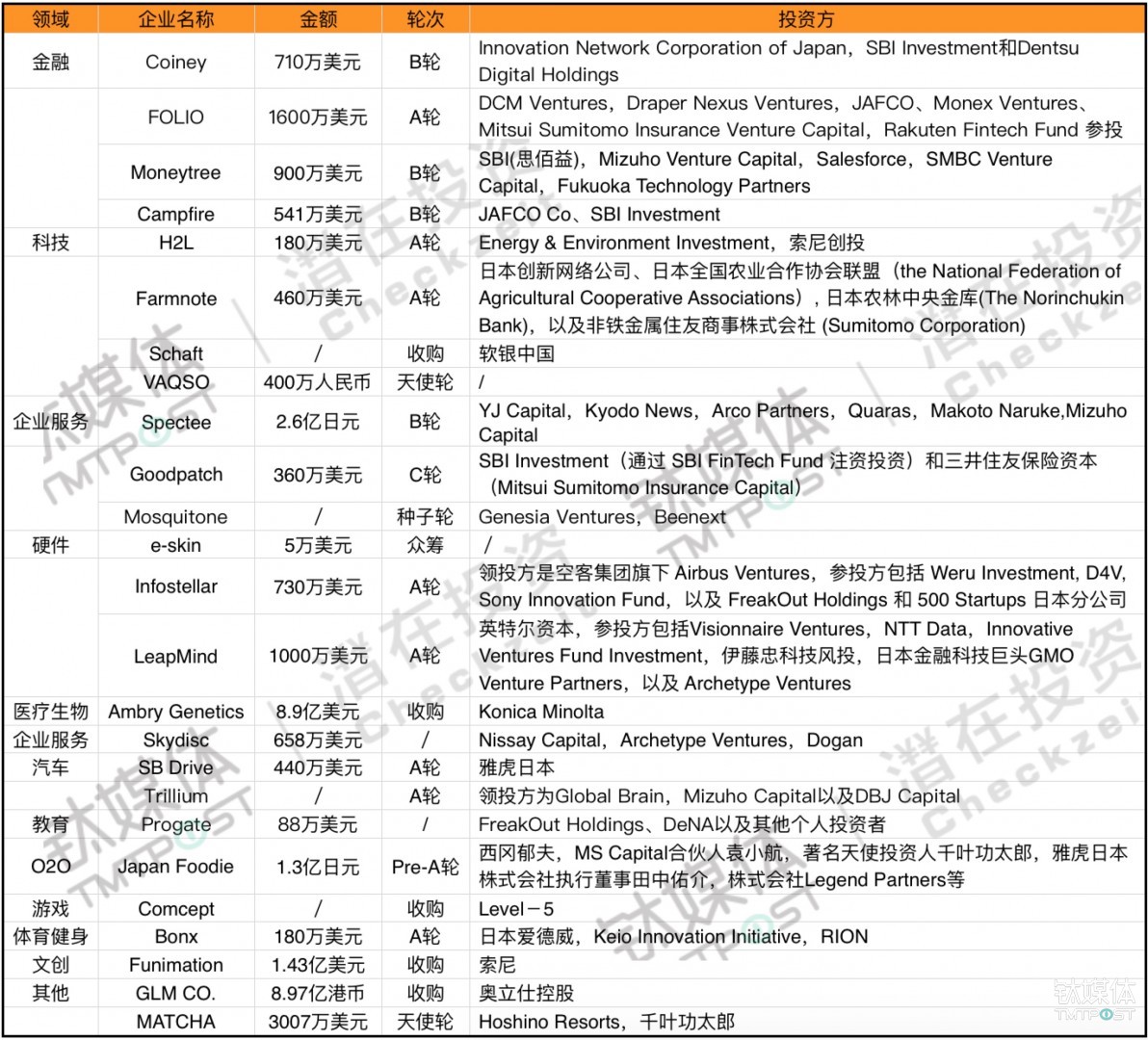 日本創(chuàng)投領(lǐng)域沒有國(guó)內(nèi)這么火熱,活躍的國(guó)內(nèi)早期資本也沒有幾個(gè),下圖是今年至今,鈦媒體Pro全球創(chuàng)投數(shù)據(jù)庫(kù)TMTBase收集的日本投融資情況。