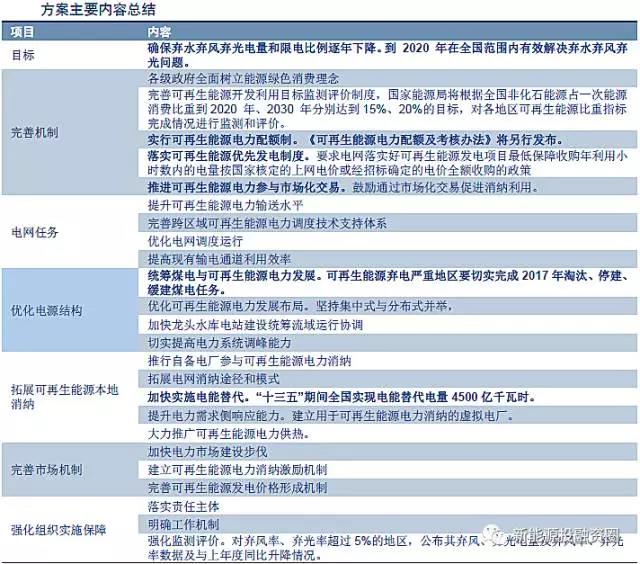 11月13日,國家發(fā)改委、能源局正式印發(fā)《解決棄水棄風(fēng)棄光問題實(shí)施方案》,明確按年度實(shí)施可再生能源電力配額制,并在2020年全國范圍內(nèi)有效解決棄水棄風(fēng)棄光問題。具體內(nèi)容總結(jié)見下表: