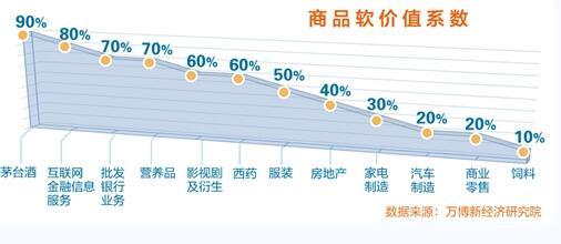 例如,飼料這樣的簡(jiǎn)單硬財(cái)富生產(chǎn)幾乎沒有軟投入,軟價(jià)值系數(shù)較低;一般的汽車制造、房地產(chǎn)等制造業(yè),隨著軟投入的增加,軟價(jià)值系數(shù)不斷提高;服裝、西藥、營(yíng)養(yǎng)品等商品,軟價(jià)值系數(shù)已經(jīng)超過50,基本屬于軟性制造;而茅臺(tái)酒的軟價(jià)值系數(shù)高達(dá)90,是典型的軟性制造模式。