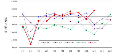 2017年10月進(jìn)口額2.84億美元,同比增長(zhǎng)23.8%;出口額18.62億美元,同比增長(zhǎng)49.6%。