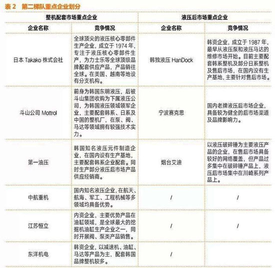 第二梯隊(duì)的企業(yè),通常會(huì)根據(jù)整機(jī)配套市場(chǎng)和售后市場(chǎng)的屬性不同,參與競(jìng)爭(zhēng)的企業(yè)也差別較大。通常整機(jī)配套企業(yè)較少參與后市場(chǎng)的競(jìng)爭(zhēng),同樣,液壓后市場(chǎng)主要企業(yè)的專注度也集中在渠道、產(chǎn)品開(kāi)發(fā),不會(huì)花大力氣和整機(jī)配套企業(yè)爭(zhēng)奪整機(jī)市場(chǎng)資源。因此大致可以將第二梯隊(duì)企業(yè)分為整機(jī)配套和液壓后市場(chǎng)企業(yè)兩類。
