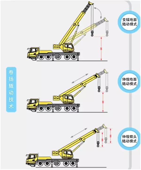 對于這些問題,徐工的工程師們也給出了完美的解決方案,這就是我接下來要說的“卷揚隨動技術(shù)”,總的來說這項技術(shù)能實現(xiàn)兩項動作:一是,在變幅和伸縮時,吊鉤與地面的距離保持不變,這樣就避免了吊鉤觸碰到地面;二是,在伸縮時,吊鉤與臂頭之間的距離保持不變,有效解決了吊鉤碰到臂頭的隱患。