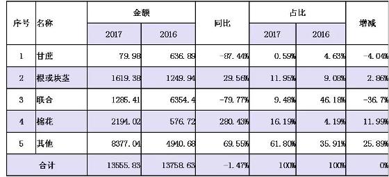 值得注意的是,根莖或塊莖和棉花收獲機(jī)出口量和出口額均出現(xiàn)不同程度的攀升,海關(guān)統(tǒng)計顯示,截至2017年11月底,進(jìn)口量分別為131臺和47臺,同比分別增長2.34%和291.67%;實(shí)現(xiàn)進(jìn)口額分別為1619.38萬美元和2194.02萬美元,同比分別大幅度攀升29.56%和280.43%。