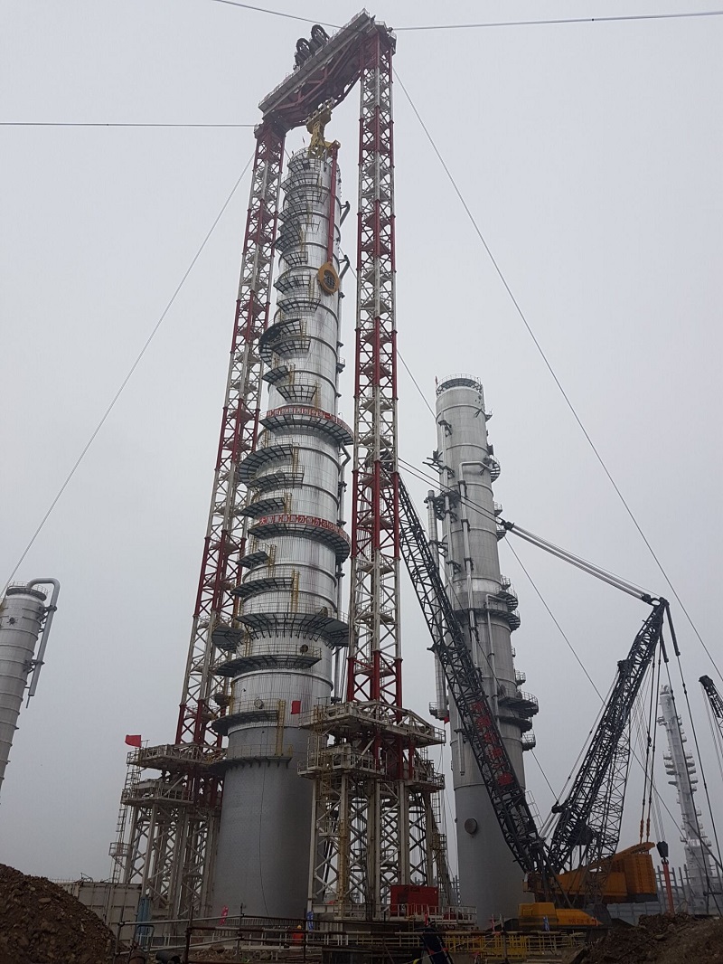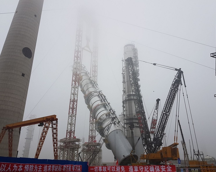 此次吊裝的1#二甲苯塔是恒力石化(大連)煉化有限公司2000萬噸/年煉化一體化項目大型設(shè)備吊裝工程1#芳烴聯(lián)合裝置中單體最重、高度最高的核心設(shè)備,設(shè)備最大直徑10.6米,高度113.1米,吊裝質(zhì)量2638噸。