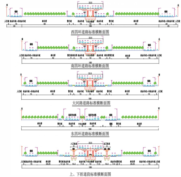 以兩條典型環(huán)線為例,大河路道路標(biāo)準(zhǔn)橫斷面設(shè)計(jì)如下,高架橋?qū)挾葹?3.5米,雙向八車道。高架橋下方設(shè)置10米的中央分隔帶,分隔帶兩側(cè)各有4個(gè)機(jī)動(dòng)車道,其中最內(nèi)側(cè)機(jī)動(dòng)車道將被設(shè)置為BRT車道。機(jī)動(dòng)車道外側(cè)是5米的慢車道,慢車道和機(jī)動(dòng)車道間有3米的隔離帶。慢車道外側(cè),是42米寬的綠化帶,綠化帶外側(cè)是輔路,輔路將被設(shè)置為機(jī)動(dòng)車道和非機(jī)動(dòng)車道的混合車道。而最外側(cè),將是5米的人行通道。