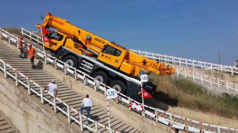 所有的靜態(tài)檢查以及演示都已結(jié)束,XCA60E以近乎完美的答卷結(jié)束了靜態(tài)檢查項(xiàng)目。接下來面臨的,也是目前全球行業(yè)內(nèi)全地面起重機(jī)從未進(jìn)行過的“極限挑戰(zhàn)”——60%坡道爬坡驗(yàn)證,這也是某些越野汽車的爬坡極限,而今天用戶將要求它在來自中國徐工的起重機(jī)上實(shí)現(xiàn)。測試內(nèi)容是司機(jī)將駕駛XCA60_E通過坡度為60%(折合角度為31°)的試驗(yàn)坡道。這考驗(yàn)的不僅是車輛的爬坡能力,還考驗(yàn)車輛的駐坡能力、縱向穩(wěn)定性、車輛通過性,即使歐美制造商也尚未開展如此大角度的實(shí)際爬坡驗(yàn)證。