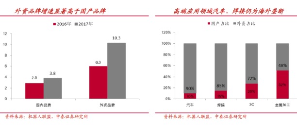 外資品牌的工業(yè)機器人繼續(xù)成為中國市場的主導力量,去年銷量達到10.3萬部,同比增幅高達71.9%;國產(chǎn)機器人達到37825部,同比增長率29.8%,但市場份額下降了6個百分點,至26.8%,結(jié)束了過去五年占有率的持續(xù)增長。(下圖來自中泰證券)