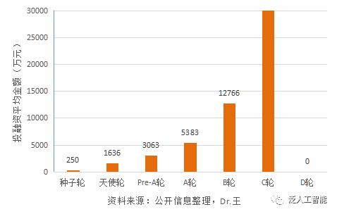 第四,從一級市場投資各輪的平均融資金額來看,機器人行業(yè)在天使輪與Pre-A輪等早期階段,所需的啟動金額相對人工智能行業(yè)公司平均融資金額較高一點。到達(dá)A輪和B輪中期時,投融資估值相對較低,也部分反映出盈利模式尚未成熟。