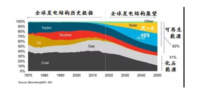 2019年7月,彭博新能源財經(jīng)發(fā)布了2019-2050年全球新能源市場展望,預(yù)計到2050年,風(fēng)電和光伏將占全球電力系統(tǒng)近一半的裝機量,并在2030年前幫助電力行業(yè)保持在控制溫升2度以內(nèi)的軌道上。