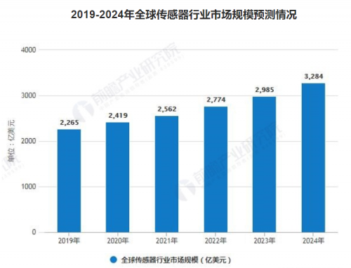 據(jù)前瞻產(chǎn)業(yè)研究院統(tǒng)計(jì)數(shù)據(jù)顯示,2018 年全球傳感器行業(yè)市場(chǎng)規(guī)模已突破 2000 億美元,未來(lái) 5 年全球傳感器市場(chǎng)將保持 8%左右的速度增長(zhǎng),到 2024 年市場(chǎng)規(guī)模將會(huì)達(dá)到 3284 億美元。