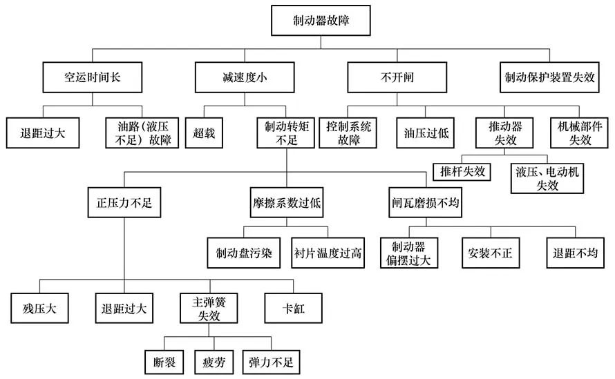 對國內(nèi)外相關(guān)制動器失效事故進行一定的分析,發(fā)現(xiàn)大部分制動器失效主要表現(xiàn)在兩個方面,一是控制信號發(fā)出但制動器不開閘,即制動器不正常工作;二是制動轉(zhuǎn)矩不足,當設備出現(xiàn)緊急情況需要急停時,制動器的制動轉(zhuǎn)矩不足而使其不能安全制動(或者在減速階段不能使卷筒的速度減?。?。從圖2可以看出,制動器主要的失效模式有制動器不開閘、制動轉(zhuǎn)矩不足、閘瓦磨損不均、空運時間過長及溫度過高。