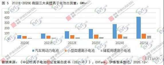 在汽車用動(dòng)力電池領(lǐng)域,隨著新能源汽車滲透率逐步提升,預(yù)計(jì)到2025年,我國動(dòng)力電池出貨量可達(dá)422.28GWh;在小型類鋰離子電池領(lǐng)域,可穿戴設(shè)備、無人機(jī)、小動(dòng)力等新興消費(fèi)領(lǐng)域?qū)?dòng)小型類鋰離子電池出貨量增長,預(yù)計(jì)到2025年,我國小型類鋰離子電池出貨量為96.0GWh;在儲(chǔ)能用鋰離子電池領(lǐng)域,隨著電力體制改革推進(jìn)、儲(chǔ)能成本降低以及鋰電替代鉛酸進(jìn)程加速,預(yù)計(jì)到2025年,我國儲(chǔ)能電池出貨量可達(dá)60.0GWh。
