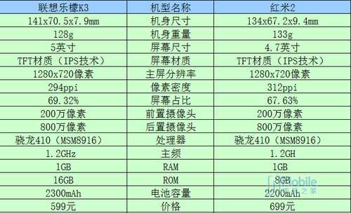 聯(lián)想樂檬K3對(duì)比紅米2(左)