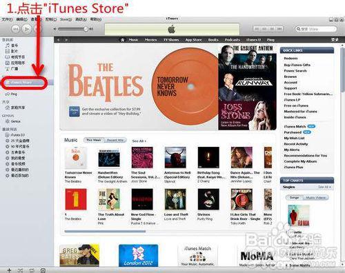 第一步.打開iTunes,進入以下頁面,點擊“iTunes Store”(提示:注銷退出已有的iTunes帳戶,如果原本就沒有就忽略)