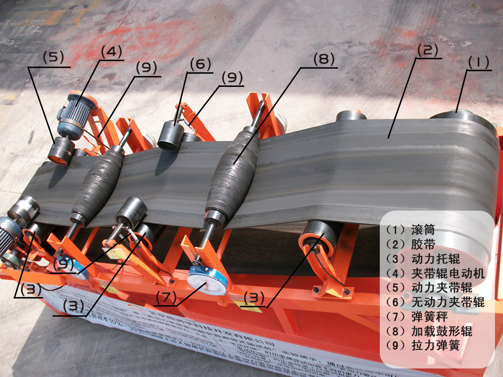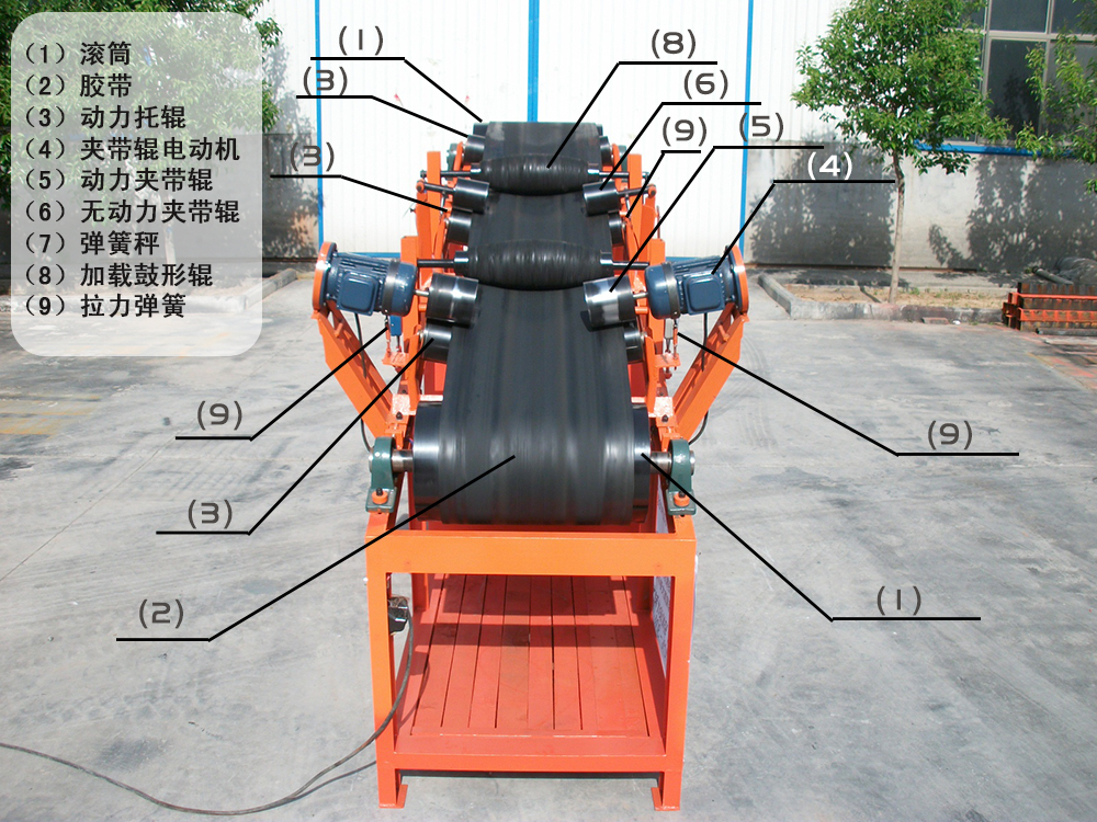序號8、部件名稱:加載鼓形輥。說明:模擬物料對膠帶進行加載。加載重力可由彈簧秤讀出。
